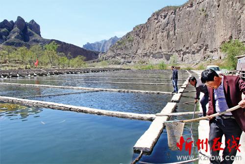 素有“江南水鄉(xiāng)”美稱的五臺縣陳家莊鄉(xiāng),是一個海拔只有640 米的秀美山鄉(xiāng),在五臺農村商業(yè)銀行“金融扶貧”、“水產(chǎn)信貸”等專項貸款的大力扶持下,鄉(xiāng)黨委、鄉(xiāng)政府圍繞得天獨厚的泉水資源, 號召農民發(fā)展水產(chǎn)養(yǎng)殖業(yè)。村民們先后建成5 個露天養(yǎng)魚場,投放名貴紅鱒魚苗150 萬尾,今年產(chǎn)量可望達到1.3 萬公斤,以每公斤68元的價格遠銷北京、西安,近銷太原、忻州、五臺山,年收入可達88 萬元。圖為村民們在山泉水養(yǎng)魚池撈魚。(金俊賢 鄭光 攝影報道)