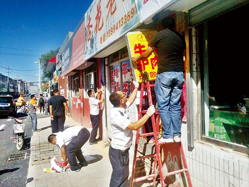沿街墻上是否掛有未經(jīng)審批的促銷橫幅,店門前的招牌是否“缺胳膊少腿”,街邊門店是否有亂擺亂放現(xiàn)象?我市全民創(chuàng)衛(wèi)進(jìn)入了集中整治階段,8月28日上午,市城建監(jiān)察支隊(duì)人員走上街頭,對沿街門店廣告、墻面廣告進(jìn)行整治。平時(shí)一些不文明的小細(xì)節(jié),一把不起眼的亂扔的掃帚都會(huì)引起城建人員的注意,建議放到店里的某個(gè)角落。全民共同動(dòng)手,創(chuàng)建我市衛(wèi)生文明城市。圖為城建人員正在氣象巷進(jìn)行墻面廣告整治。(張志遠(yuǎn) 攝)