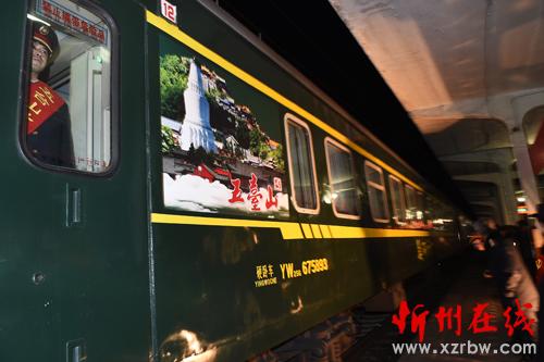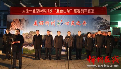 本報訊(記者 楊峰雷)1月11日晚23時20分,車廂標(biāo)有“美麗忻州心靈之舟”及五臺山標(biāo)志性古建大白塔圖案、由太原開往北京的K602次列車緩緩駛?cè)胄弥菡荆@標(biāo)志著“五臺山號”列車正式開行。開行首發(fā)儀式在忻州火車站站臺舉行,市委書記李俊明下達(dá)開行指令,市長鄭連生、太原鐵路局副局長劉楓分別致辭。市人大常委會主任賈雪峰,市政協(xié)主席劉鋼柱,市委常委、宣傳部長、統(tǒng)戰(zhàn)部長陳義青,市委常委、秘書長崔建新出席儀式。市委常委、常務(wù)副市長趙志堅主持。