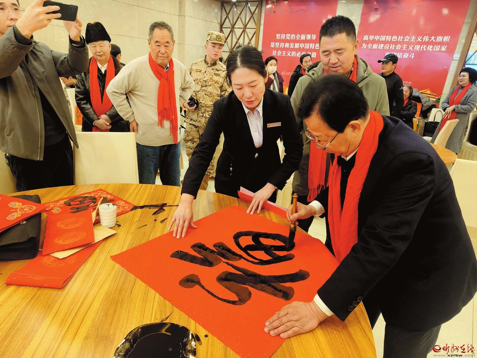 在2025年春節(jié)即將到來(lái)之際,由山西大眾書畫院、山西中華文化促進(jìn)會(huì)、山西省書法家協(xié)會(huì)、山西省美術(shù)家協(xié)會(huì)、山西中國(guó)畫學(xué)會(huì)、山西老年書畫家協(xié)會(huì)、山西武警某部、書畫頻道山西工作中心、晉善晉美控股集團(tuán)、山西省祁寓藻研究會(huì)、山西省鄉(xiāng)村振興聯(lián)合會(huì)共同舉辦的“開(kāi)創(chuàng)美好未來(lái)——2025軍民魚水情迎春書畫筆會(huì)”在山西省人大會(huì)議中心舉行。我市退休干部袁旺水等參加了創(chuàng)作交流。 (栗美霞 攝)