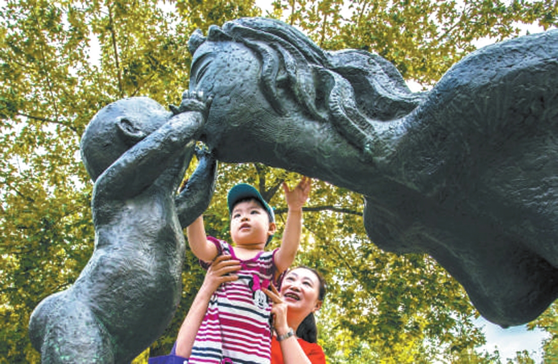 公園里,孩子在“母愛”主題的雕塑前玩耍。陳啟亮攝