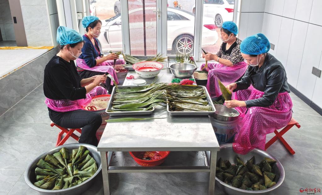 端午節(jié)臨近,粽子迎來(lái)銷售旺季。定襄縣的寶宗生態(tài)農(nóng)業(yè)科技有限公司全力投入粽子的生產(chǎn)加工。工作人員圍在桌子旁包粽子,先是理粽葉、挽漏斗、填糯米、配餡料,再壓緊實(shí)、封好口、扎定型,之后上鍋蒸煮。(張錦娟 攝)