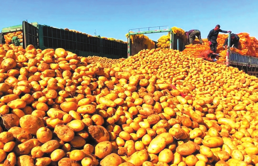 大田作物中,玉米貢獻了秋收“主色調(diào)”:玉米田穗大粒滿,金黃果穗綴滿秸稈,機械化收割設備穿梭田間。高粱與谷子在丘陵山區(qū)長勢喜人,紅透的高粱穗與沉甸甸的谷穗隨風搖曳。土豆則以“地下黃金”之姿獲得豐產(chǎn),圓整塊莖從土壤中翻出,分揀后裝車外運。