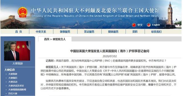 當(dāng)?shù)貢r間7月2日,中國駐英國大使館發(fā)言人就英國國民(海外)護照事答記者問時表示,關(guān)于英國國民(海外)護照問題,英方曾與中方互換備忘錄,明確承諾不給予持有英國國民(海外)護照的香港中國公民在英居留權(quán)。中國全國人大常委會在《關(guān)于〈中華人民共和國國籍法〉在香港特區(qū)實施的幾個問題的解釋》中明確指出,所有香港中國同胞,不論其是否持有“英國屬土公民護照”或者“英國國民(海外)護照”,都是中國公民。