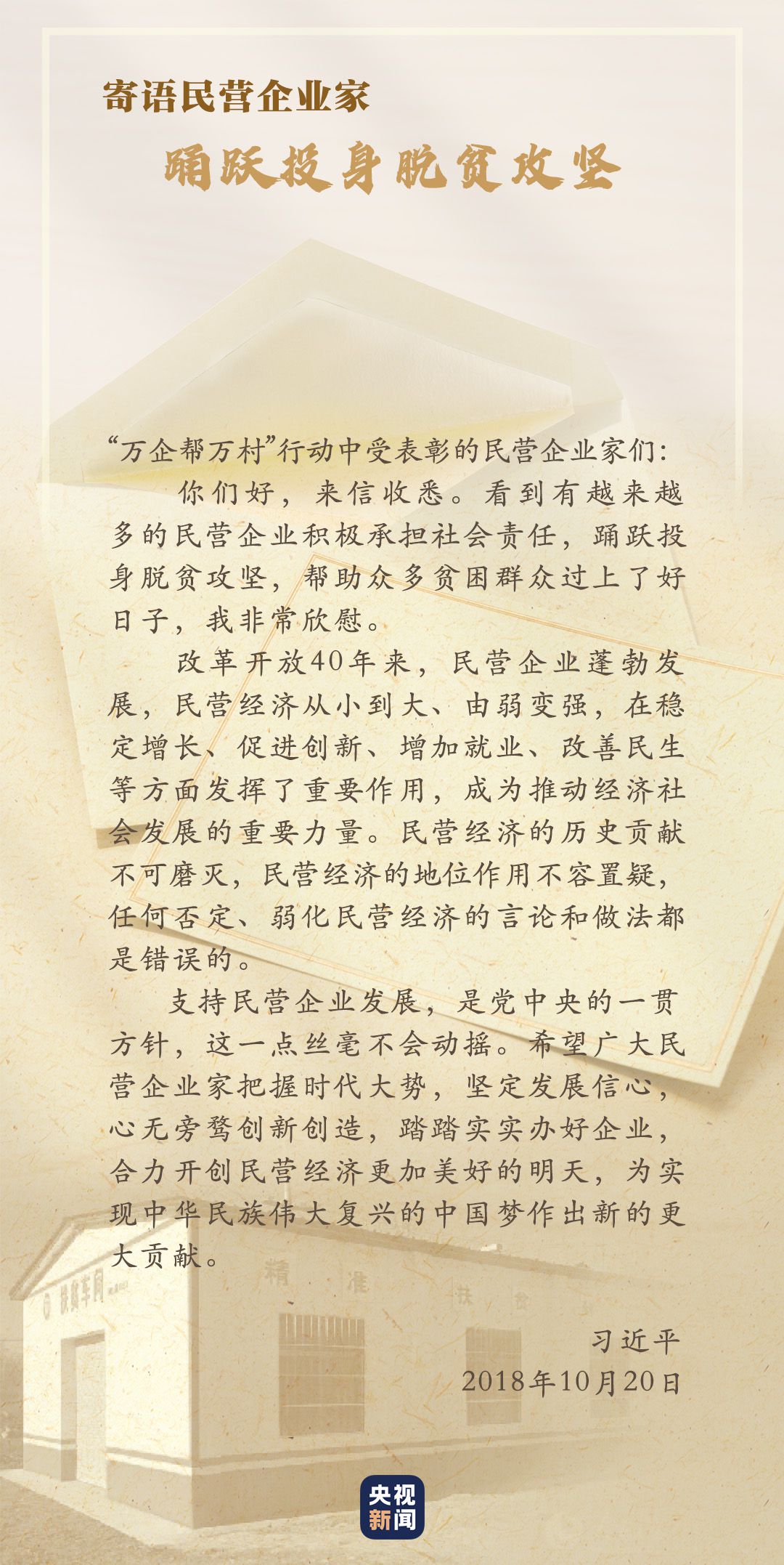 習近平對民營企業(yè)高度重視,給“萬企幫萬村”行動中受表彰的民營企業(yè)家回信,對他們踴躍投身脫貧攻堅予以肯定,勉勵廣大民營企業(yè)家堅定發(fā)展信心,踏踏實實辦好企業(yè)。
