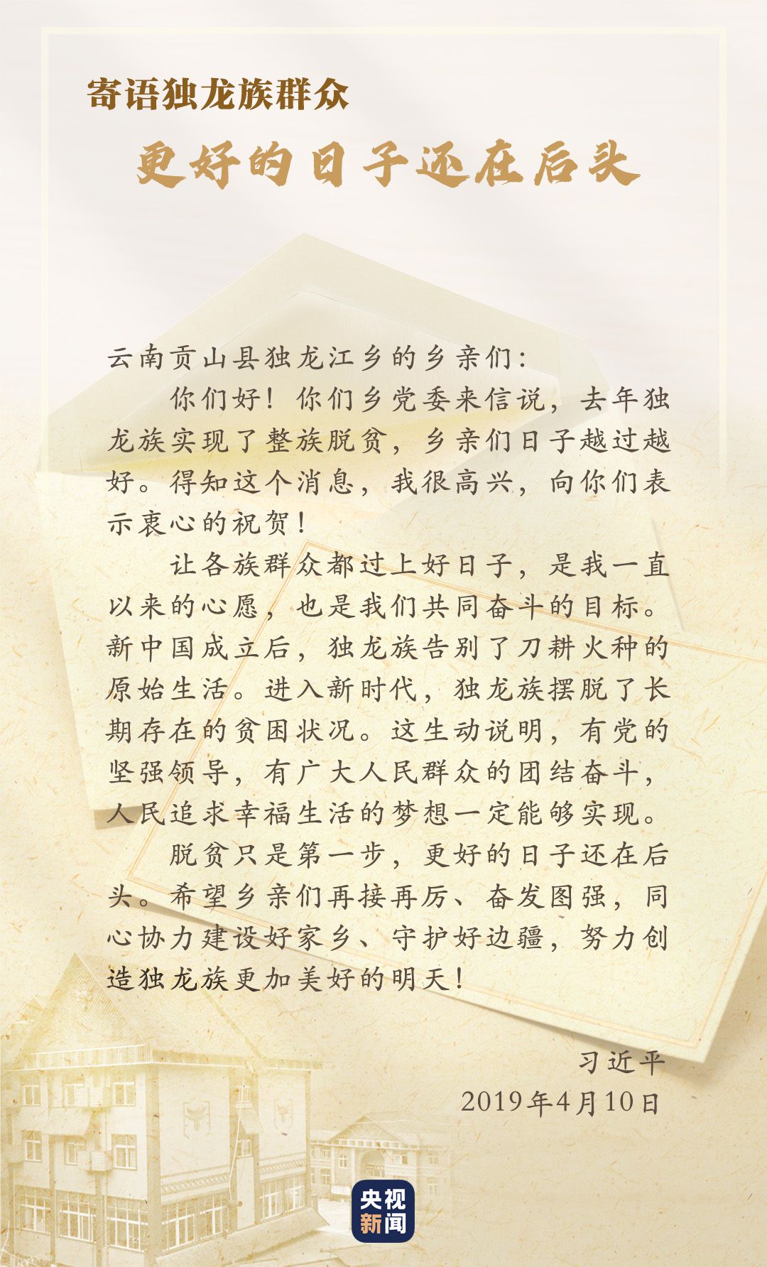 2018年,獨龍江鄉(xiāng)6個行政村整體脫貧,獨龍族實現(xiàn)整族脫貧,基礎設施、特色產業(yè)、社會事業(yè)等都發(fā)生了巨大變化。貢山縣干部群眾再次給習近平寫信匯報脫貧成績,習近平得知后非常高興,向他們表示“衷心的祝賀”,并勉勵鄉(xiāng)親們?yōu)檫^上更加幸福美好的生活繼續(xù)團結奮斗。