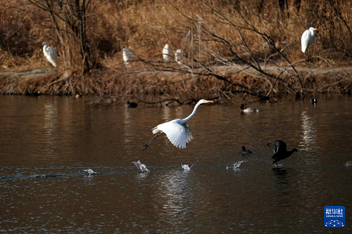 2025年1月1日,白鷺在太原市汾河覓食。(新華社記者 詹彥 攝)