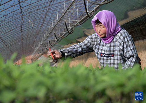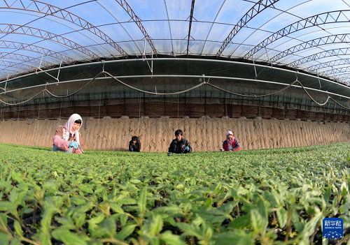 1月5日,河北省唐山市曹妃甸區(qū)第六農(nóng)場曾家灣三村的農(nóng)民在育苗棚內管護西紅柿秧苗。(新華社記者 楊世堯 攝)