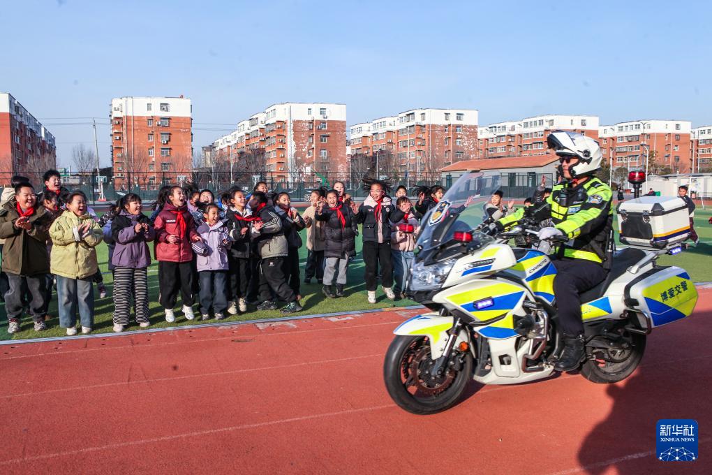 1月9日,山東省棗莊市公安局市中分局交通警察大隊(duì)民警在當(dāng)?shù)匚幕沸W(xué)與學(xué)生互動(dòng)宣傳交通安全知識(shí)。(新華社發(fā) 孫中喆 攝)