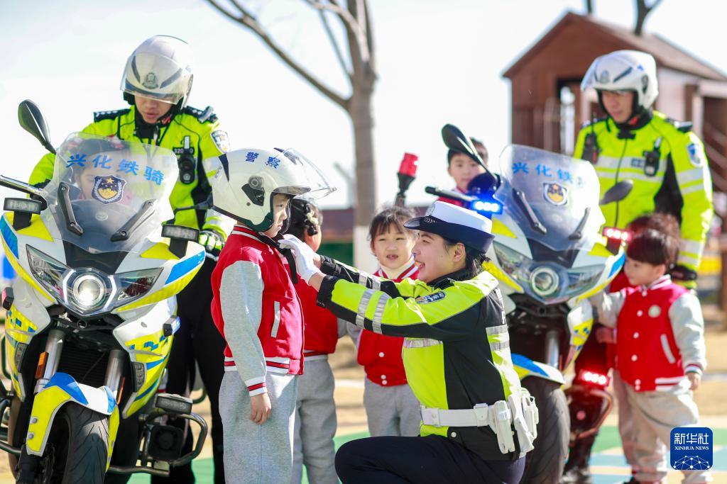 1月9日,在江蘇省興化市文峰幼兒園,興化市公安局交警給小朋友講解如何正確佩戴頭盔。(新華社發(fā) 周社根 攝)