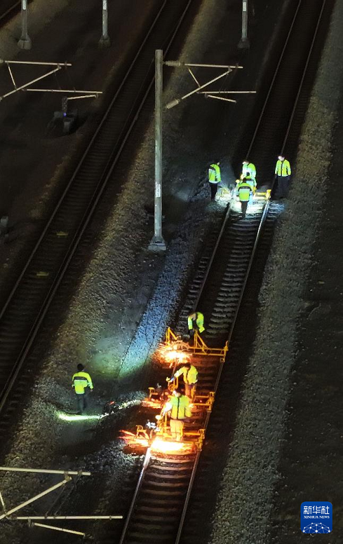 1月16日凌晨,長沙高鐵工務(wù)段線路工在長沙南站滬昆場打磨鋼軌(無人機照片)。(新華社記者 陳振海 攝)