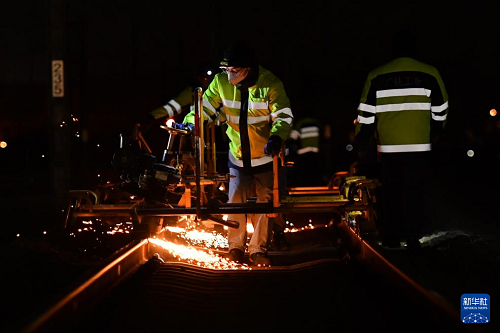 1月16日凌晨,長沙高鐵工務(wù)段線路工在長沙南站滬昆場打磨鋼軌。(新華社記者 陳振海 攝)