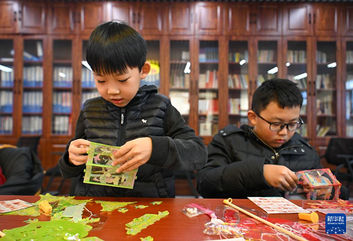 1月16日,在天津市河東區(qū)大王莊街道麟祥里社區(qū)活動室,小朋友在制作春節(jié)花燈。(新華社記者 孫凡越 攝)