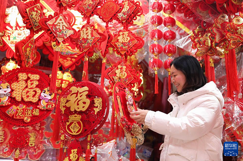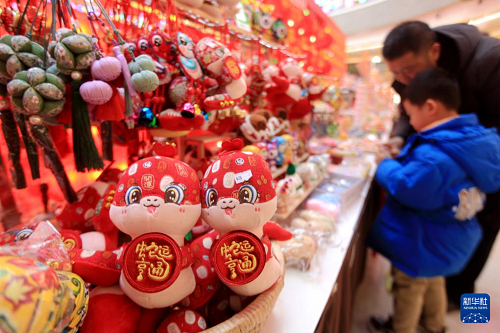 1月22日,人們?cè)诤幽鲜∑巾斏绞袑氊S縣一市場(chǎng)選購(gòu)新年飾品。(新華社發(fā) 何五昌 攝)