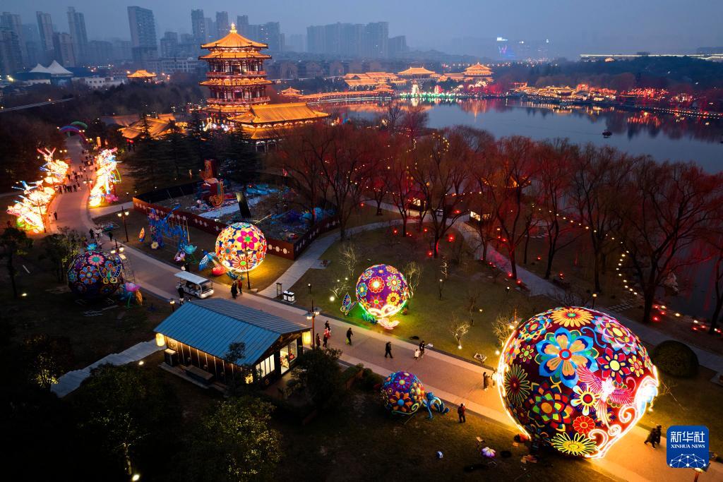 1月22日晚,游客在西安大明宮國家遺址公園賞燈(無人機照片)。(新華社記者 鄒競一 攝)