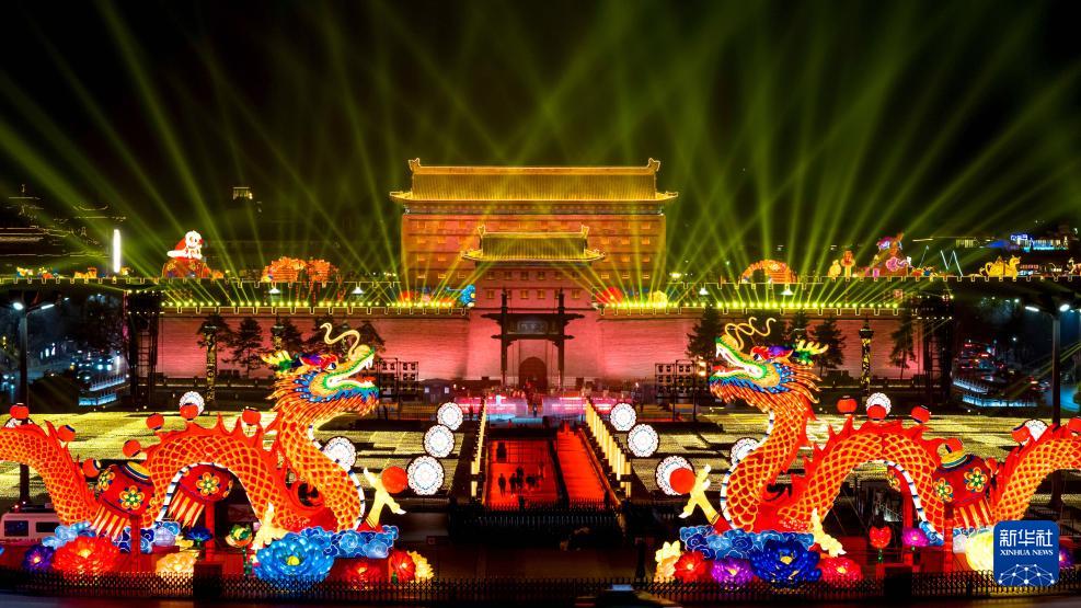 1月22日晚拍攝的西安城墻永寧門前的巨型花燈(無人機照片)。(新華社記者 鄒競一 攝)
