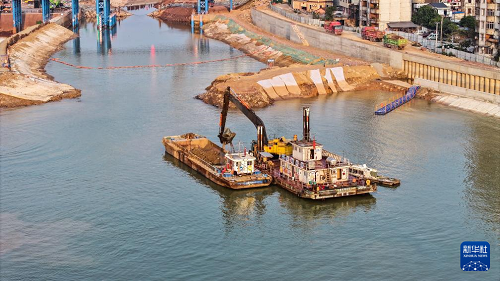 施工單位在疏浚平陸運(yùn)河航道(2月4日攝,無(wú)人機(jī)照片)。(新華社記者 張愛林 攝)