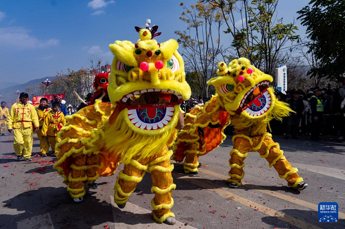 2月6日,人們在南澗縣龍燈會上表演舞獅。(新華社記者 陳欣波 攝)