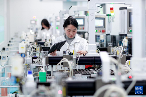2月7日,工作人員在江蘇省興化市陳堡鎮(zhèn)的江蘇華能電子有限公司自動化生產(chǎn)線旁忙碌。(新華社發(fā) 周社根 攝)