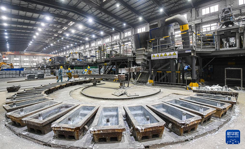 2月7日,在湖南省常寧市水口山經(jīng)濟(jì)開發(fā)區(qū),湖南株冶有色金屬有限公司熔鑄車間工人在生產(chǎn)作業(yè)。(新華社發(fā) 周秀魚春 攝)