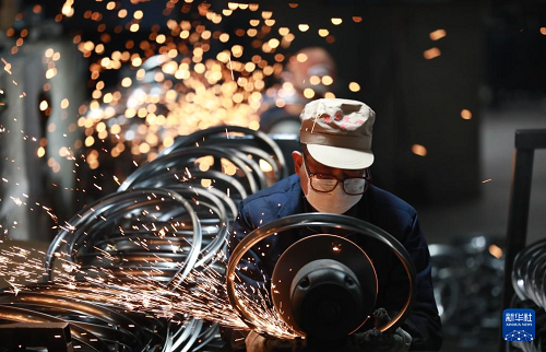2月11日,在浙江省杭州市臨安區(qū)天目山鎮(zhèn)一家外貿(mào)企業(yè),工人在對(duì)準(zhǔn)備銷往海外的自行車鋼圈進(jìn)行拋光作業(yè)。(新華社發(fā) 胡劍歡 攝)