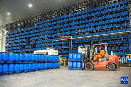 2月11日,在重慶市長(zhǎng)壽區(qū)的中國(guó)石化川維化工VAE(醋酸乙烯-乙烯共聚乳液)項(xiàng)目,工作人員在轉(zhuǎn)運(yùn)產(chǎn)品。(新華社記者 唐奕 攝)
