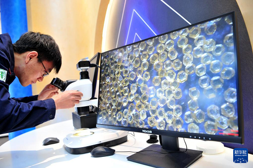 2月11日,在湖北省宜昌市夷陵區(qū)一家鉆石生產(chǎn)加工企業(yè),工人在檢查金剛石單晶的質(zhì)量。(新華社發(fā) 張國(guó)榮 攝)