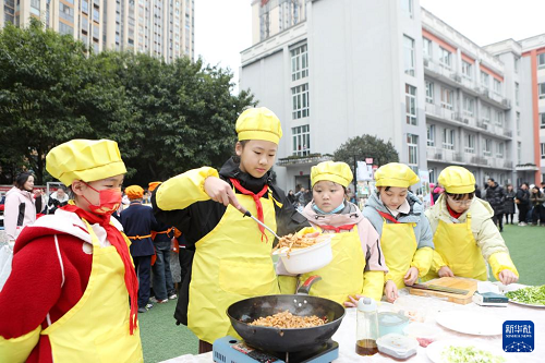 2月16日,在重慶市永川區(qū)紅專小學(xué),學(xué)生們參加“第三屆生活節(jié)暨讀書節(jié)”中的烹飪比賽,迎接新學(xué)期。(新華社發(fā) 陳仕川 攝)