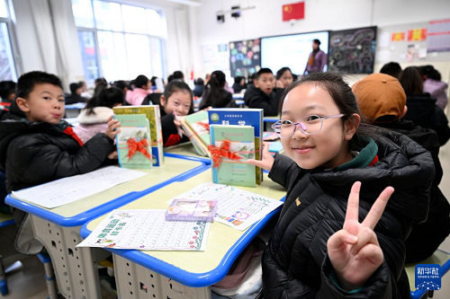 2月16日,寧夏銀川市興慶區(qū)實(shí)驗(yàn)二小學(xué)生在展示領(lǐng)到的新課本。(新華社記者 王鵬 攝)