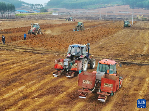 2月19日,在廣西來賓市興賓區(qū)鳳凰鎮(zhèn)國家現(xiàn)代農(nóng)業(yè)產(chǎn)業(yè)園黃安優(yōu)質(zhì)“雙高”糖料蔗基地,農(nóng)民駕駛農(nóng)機(jī)在田間作業(yè)(無人機(jī)照片)。(新華社記者 周華 攝)
