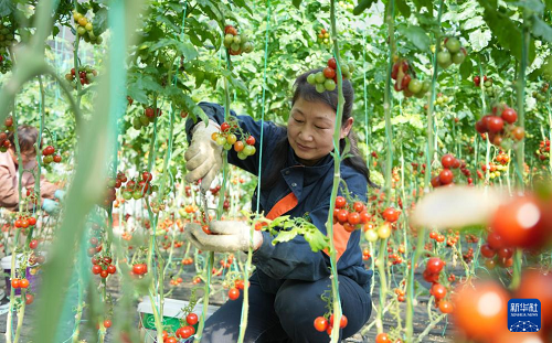 2月19日,在山東省濰坊市寒亭區(qū)前闕莊村,村民在收獲西紅柿。(新華社記者 徐速繪 攝)