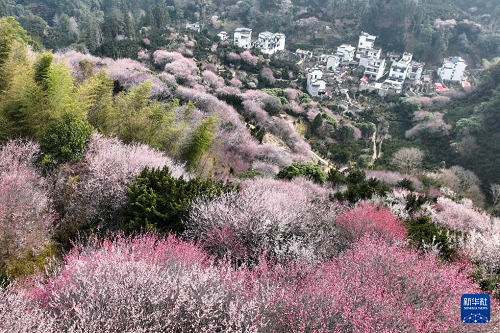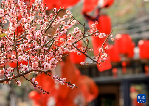 2月26日,在安徽省黃山市歙縣雄村鎮(zhèn)賣花漁村,綻放的梅花與徽派村落民居相映成趣。(新華社發(fā) 樊成柱 攝)