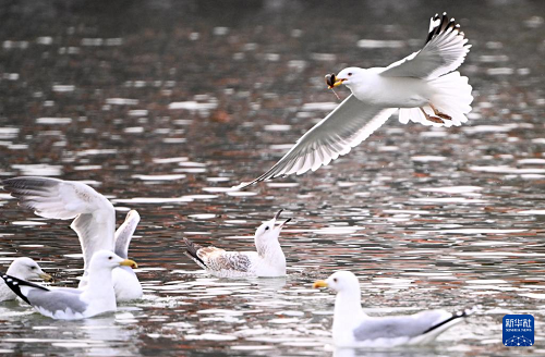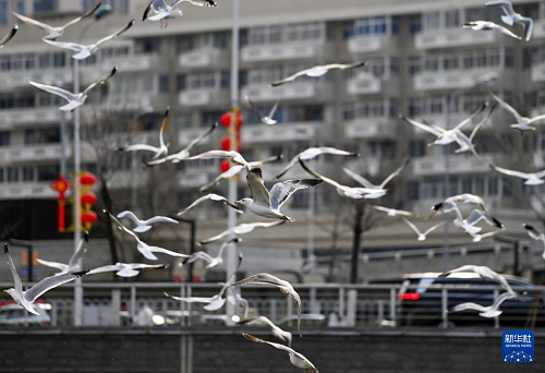 近來,隨著氣溫回暖,大批海鷗在天津市海河沿岸金鋼橋附近翔集、覓食。