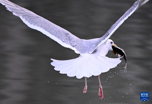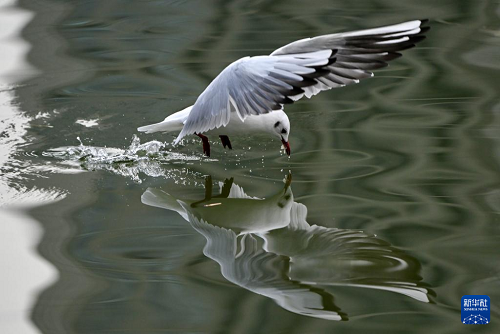 3月4日,一只海鷗在海河上覓食。(新華社記者 趙子碩 攝)