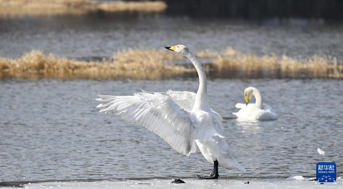 3月4日,天鵝在密云水庫流域的清水河內(nèi)戲水。(新華社記者 李欣 攝)