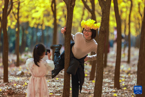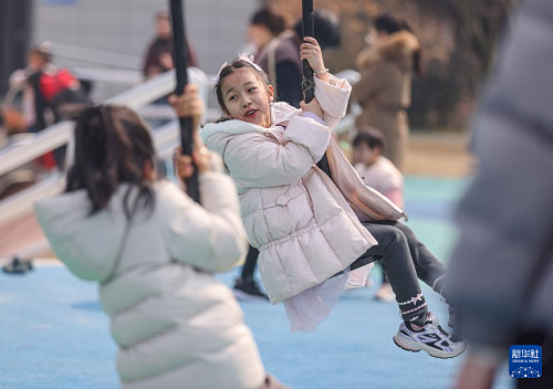 3月9日,市民在山東省榮成市桑干河植物園一處口袋公園游玩休閑。(新華社發(fā) 李信君 攝)