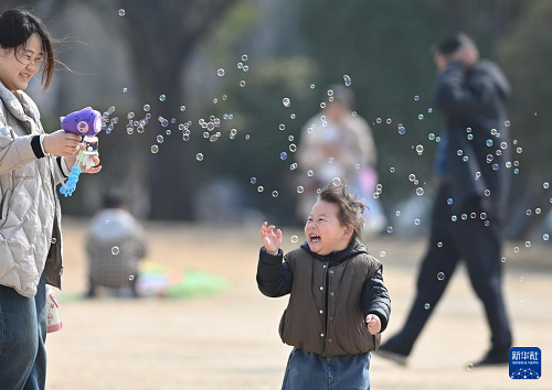 3月9日,家長和孩子在山東省滕州市一處公園玩泡泡。(新華社發(fā) 李志軍 攝)