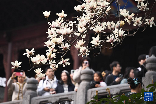 3月9日,游客在南京朝天宮觀賞拍攝玉蘭花。(新華社發(fā) 楊素平 攝)