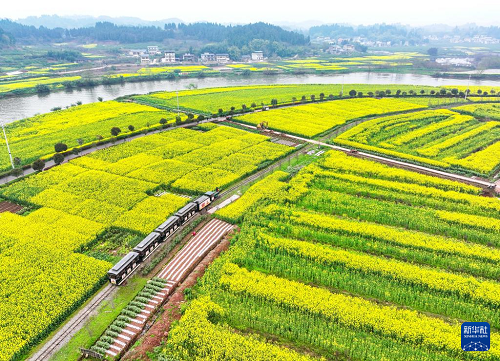 3月12日,游客乘坐“小火車(chē)”在重慶潼南崇龕花海景區(qū)游覽(無(wú)人機(jī)照片)。(新華社記者 王全超 攝)