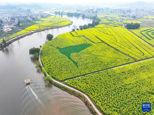3月12日,游客乘坐游船在重慶潼南崇龕花海景區(qū)游覽(無(wú)人機(jī)照片)。(新華社記者 王全超 攝)