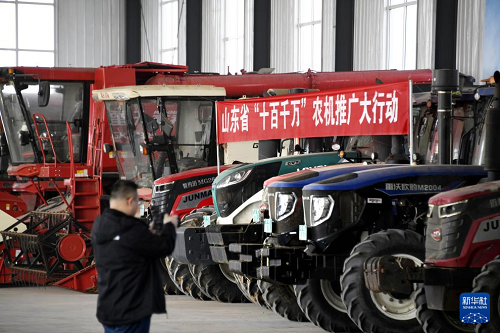 在青島同富勤耕農(nóng)機(jī)專業(yè)合作社機(jī)庫(kù)內(nèi),加裝了北斗系統(tǒng)的農(nóng)機(jī)設(shè)備整齊排列(3月13日攝)。(新華社記者 李紫恒 攝)