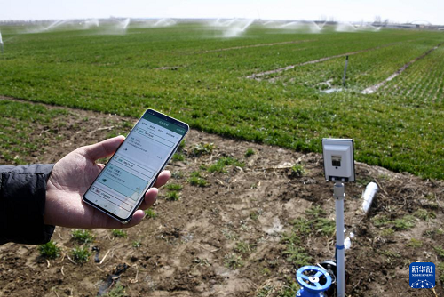 3月13日,在青島西海岸新區(qū)大場(chǎng)鎮(zhèn)一處農(nóng)田里,農(nóng)技人員通過(guò)無(wú)人農(nóng)場(chǎng)數(shù)字化平臺(tái)手機(jī)端控制農(nóng)田灌溉。(新華社記者 李紫恒 攝)