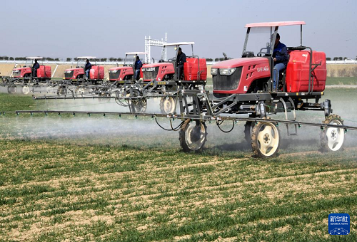 3月13日,在青島西海岸新區(qū)綠色增糧先行示范區(qū)農(nóng)田里,自走式噴桿噴霧機(jī)進(jìn)行小麥莖基腐病春季防控作業(yè)。(新華社記者 李紫恒 攝)