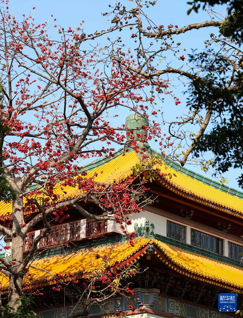 木棉花與廣州中山紀(jì)念堂相映成趣(3月19日攝)。(新華社記者 鄧華 攝)