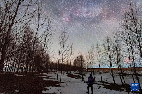 3月29日凌晨,一名游客在黑龍江省富錦市觀賞“銀河拱橋”。(新華社發(fā) 曲玉寶 攝)
