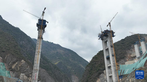 這是3月31日在渝昆高鐵洛澤河特大橋懸臂澆筑施工現(xiàn)場拍攝的“虹鷹1號(hào)”智能懸臂筑橋機(jī)(無人機(jī)照片)。(新華社發(fā) 彭洪 攝)