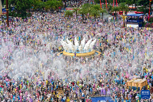4月15日,人們?cè)谠颇鲜∥麟p版納傣族自治州景洪市潑水廣場(chǎng)潑水狂歡。(新華社記者 高詠薇 攝)