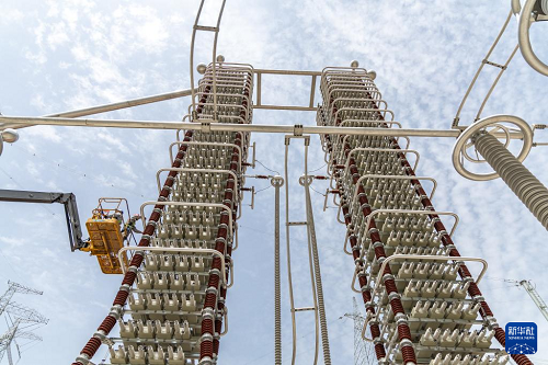 4月16日,安徽送變電工程有限公司施工人員在“疆電入渝”特高壓工程渝北換流站建設(shè)現(xiàn)場對電容器塔設(shè)備進行調(diào)試驗收。(新華社記者 黃偉 攝)
