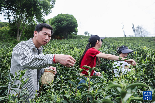 4月16日,參加茶文化主題活動(dòng)的市民在建德市新安江街道嶺后大坪茶園體驗(yàn)采茶。(新華社記者 徐昱 攝)