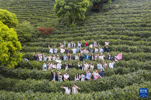 4月16日,參加茶文化主題活動(dòng)的青年在建德市新安江街道嶺后大坪茶園合影(無人機(jī)照片)。(新華社記者 徐昱 攝)